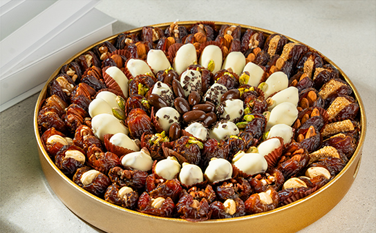 Our showroom is located in Sweifieh, Amman, where you can explore our exclusive collection of rich Medjoul dates coated in premium Belgian chocolate, stuffed dates, and plain dates. We also offer a wide selection of in-house date cakes, tarts, cookies, truffles, and other luxurious delicacies.